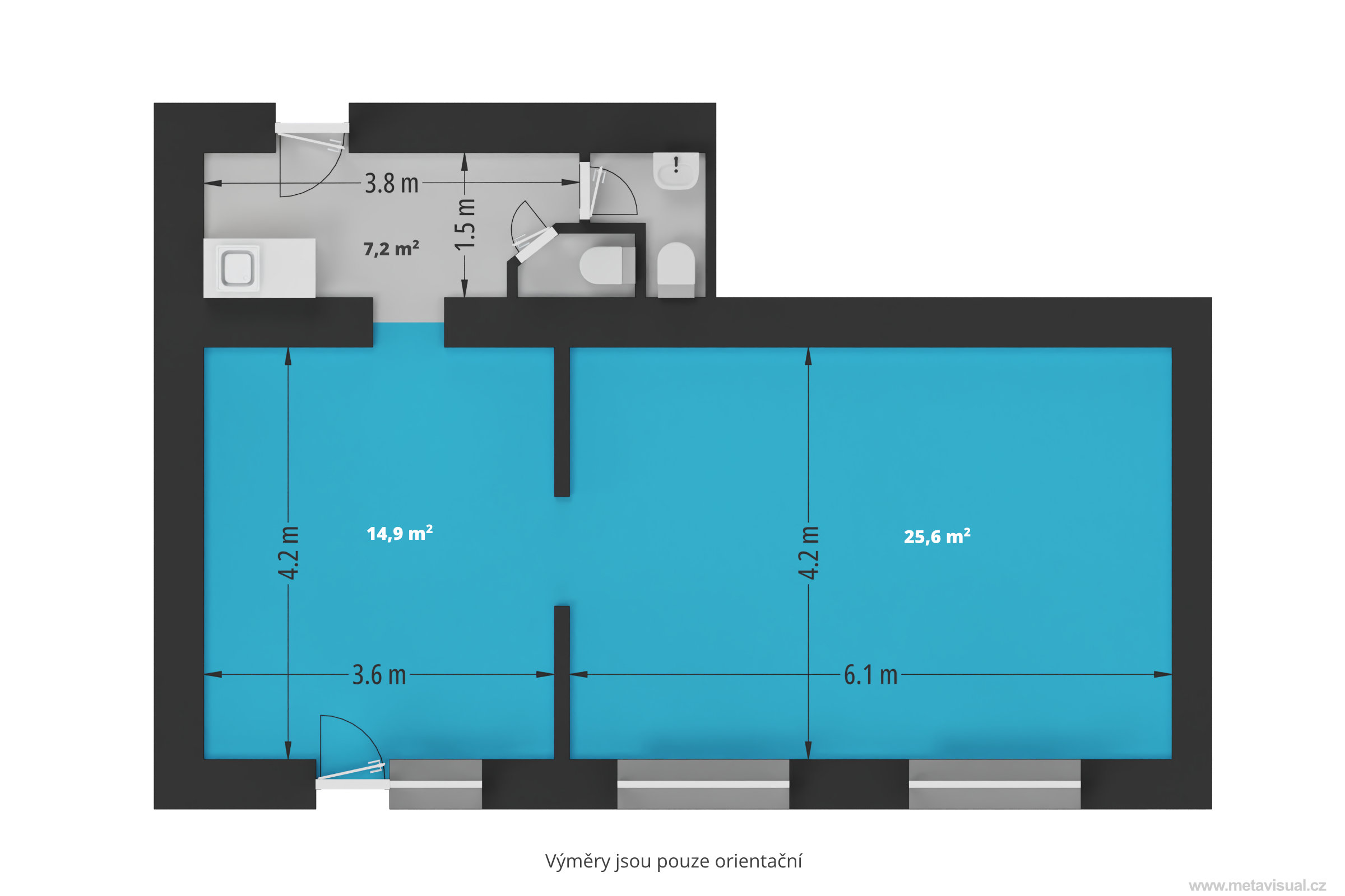 Prostor má velkoformátová okna s předokenními roletami.